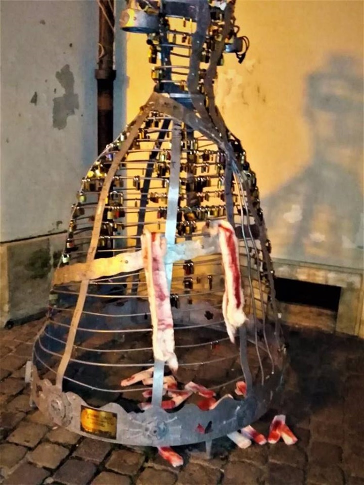 Intervencija na skulpturu "Krinolina ljubavi" Ivana Meseka, Varaždin; 2019 / Intervention into a public space sculpture "Crinoline of love" made by Ivan Mesek; Varaždin; 2019 Intervencija se sastojala od vješanja 'okrvavljenih' krpa i vate na skulpturu, te paljena lučica oko krinoline kao memento za žene žrtve patrijarhalnog nasilja i standarda ljepote. / Intervention was made by putting of 'bloody' rags and cotton pads onto the sculpture. Small candles were lit around the skirt as a memento for women victimized by the patriarchy and by the harmful beauty practices.
