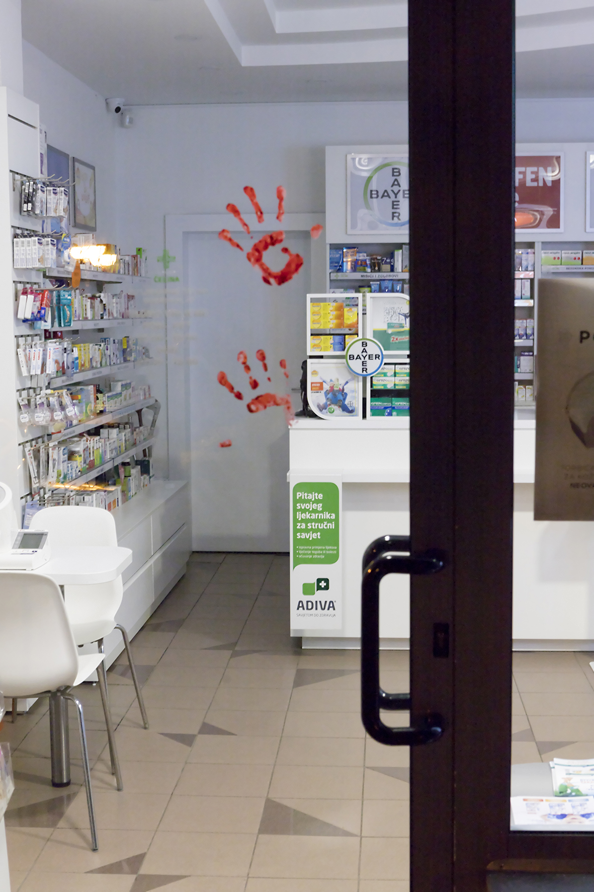 Prekinimo šutnju; sa Sanjom Kovačević; Ljekarna Čelina, Zagreb, 2018 / Stop the silence; with Sanja Kovačević; Apothecary Čelina, Zagreb, 2018 Akcija je izvedena otiskivanjem 'krvavih' dlanova na ljekarnu u kojoj su odbili prodati kontracepcijske pilule jednoj djevojci. / Action was made by printing of 'bloody' palms onto the windows of the apothecary that refused to sell contraception pills to a woman.